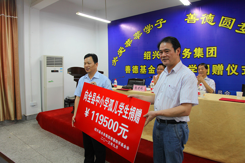 儀式上,集團(tuán)倪董事長介紹了“善德基金”基本情況,并現(xiàn)場向今年受助的全縣81名中小學(xué)孤兒學(xué)生捐贈了“善德基金”助學(xué)款119500元,資助標(biāo)準(zhǔn)為小學(xué)生每人每學(xué)年1000元,初中生每人每學(xué)年1500元,高中生每人每學(xué)年2000元,并從今年開始對全縣孤兒從小學(xué)到高中讀書期間每年給予捐助。縣教體局局長蔣國洪以及縣老領(lǐng)導(dǎo)、縣關(guān)工委主任李會鵬分別作了講話,他們對集團(tuán)強(qiáng)烈的社會責(zé)任感以及情系困難學(xué)生的善心義舉給予了高度的肯定和贊揚(yáng),希望受助學(xué)生學(xué)會堅守,學(xué)會感恩,學(xué)會奉獻(xiàn),并呼吁社會各界為孩子們快樂成長、展翅高飛而共同努力。