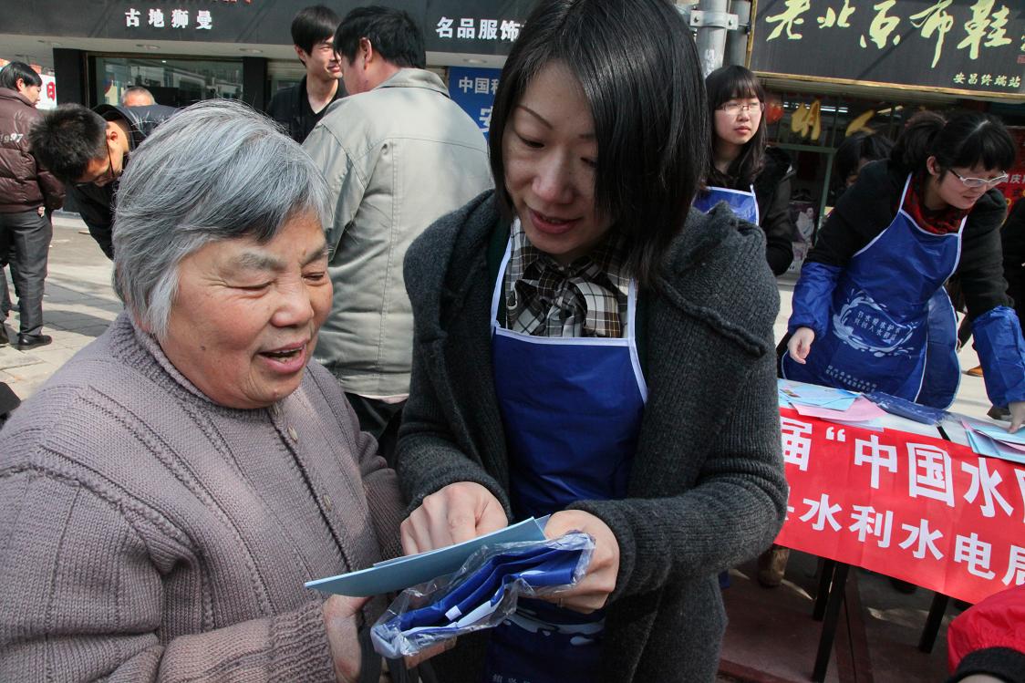 圖為工作人員向過往的居民宣傳節(jié)水、護(hù)水知識