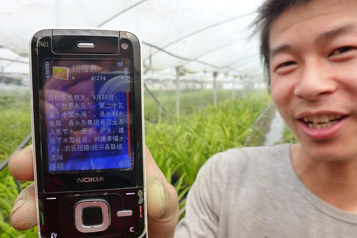 圖為農(nóng)民朋友正在查看通過“農(nóng)民信箱”發(fā)送過來的節(jié)水知識短信