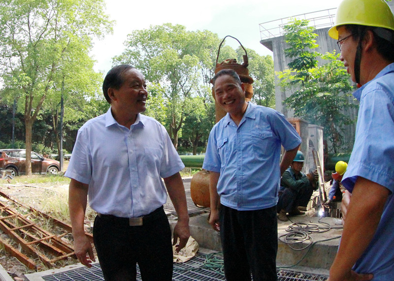 圖為集團(tuán)副總經(jīng)理、紹興水處理公司董事長胡張堯在紹興水處理公司放空泵房導(dǎo)軌更換現(xiàn)場慰問維修人員