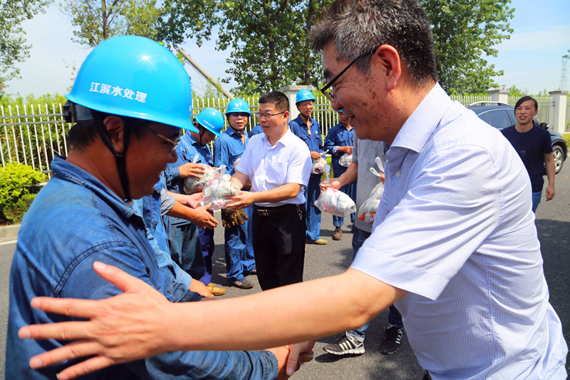 圖為集團(tuán)副總經(jīng)理張則再在江濱水處理公司一體化生化池機(jī)修現(xiàn)場慰問運(yùn)行工人