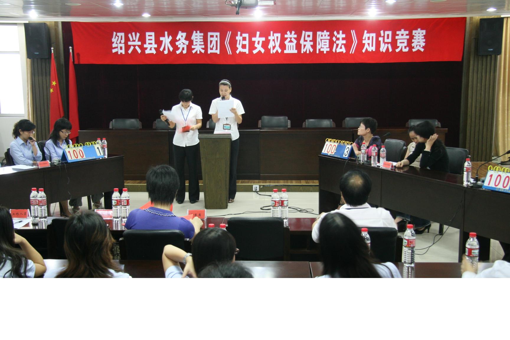 為廣泛深入地學習、宣傳、貫徹《中華人民共和國婦女權益保障法》,提高廣大女職工的法律意識及依法維護自身利益的能力,在“十一”前夕,水務集團婦聯舉辦《中華人民共和國婦女權益保障法》知識競賽。來自集團機關、供水、排水、水處理公司婦委會等4支女職工代表隊參加比賽。本次競賽以現場答題形式,分個人必答題、小組必答、搶答題和風險題。活動在大家積極踴躍,熱情高漲。經過緊張激勵的角逐,最終水處理婦委會榮獲第一名。