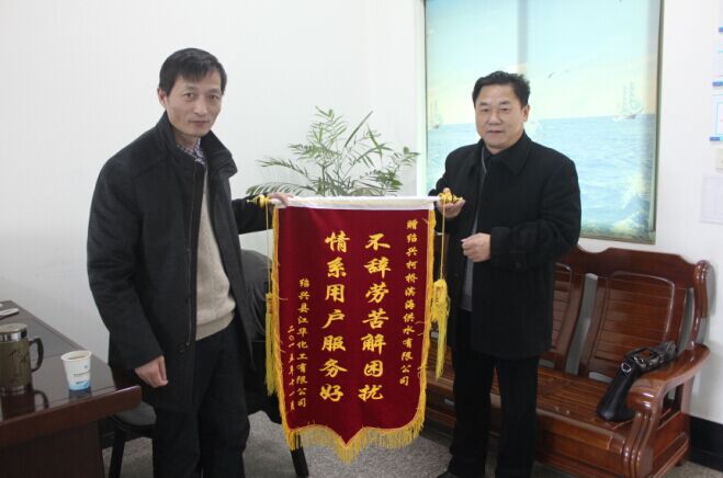 11月30日,紹興江華化工有限公司負(fù)責(zé)人來到公司,送來 “不辭辛勞解困擾,情系用戶服務(wù)好”的錦旗,對濱海供水公司長期以來為企業(yè)解決難題,營造良好的供水環(huán)境,提供高效的服務(wù)支持過程中表現(xiàn)出來的管理高水平、人員高素質(zhì)、工作高效率表示深深感謝。